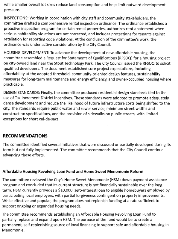 Council members additionally received the final report (found below) of the City of Menomonie Ad Hoc Housing Committee, prepared by Chair Cody Gentz.