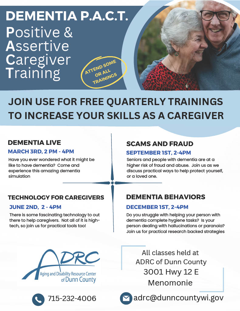 Dementia Caregiver quarterly Training - March 3rd, June 2nd, Sept. 1st, and Dec. 1stFeb 161 min readJoin us for free quarterly trainings to increase your skills as a caregiver.From the Dunn County ADRC Facebook page.
